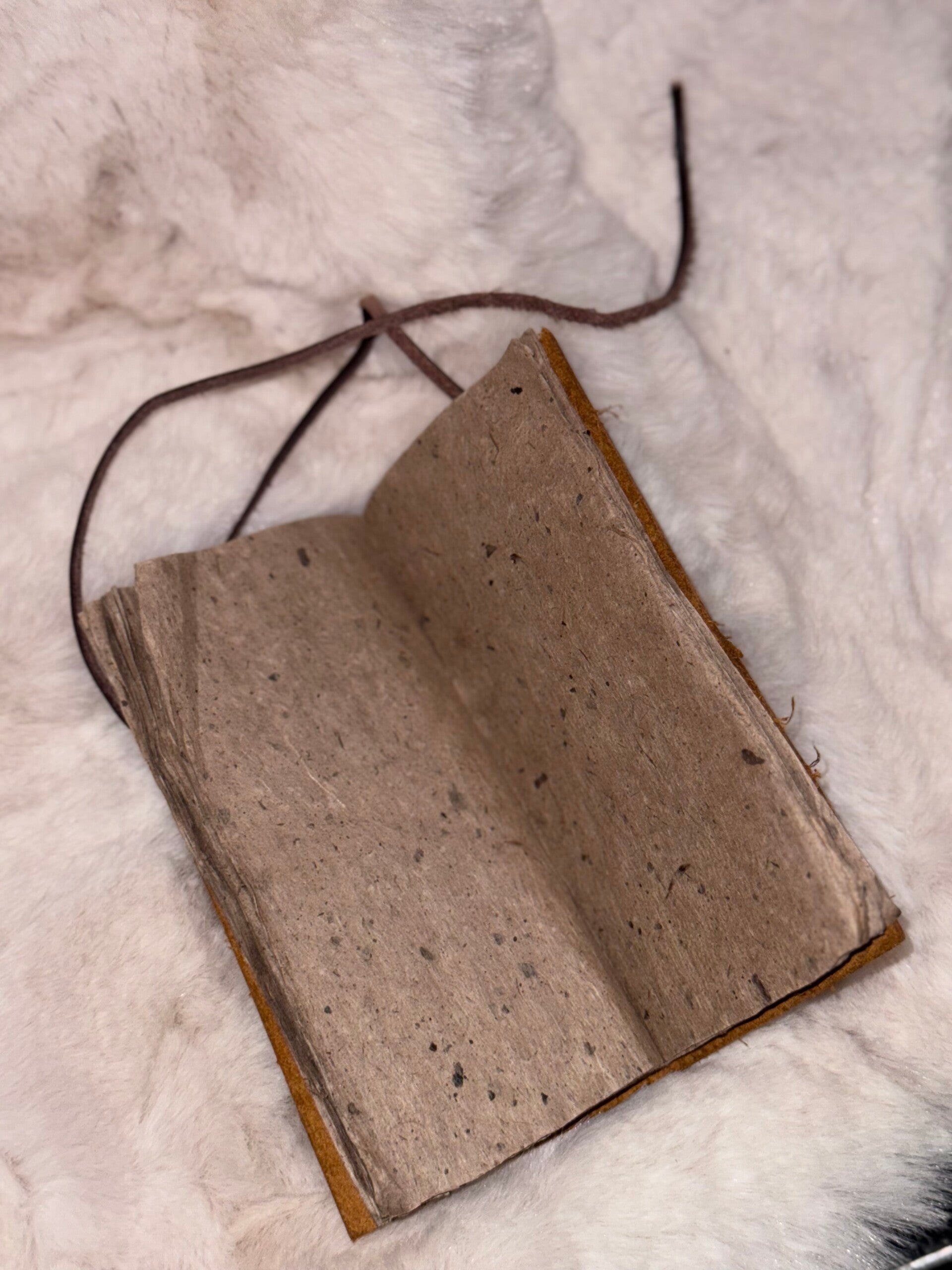 Handmade schrijfboekje met een flap en veter van rundleer. De binnenwereld is vintage moerbeipapier en de afmeting is 16x8cm.