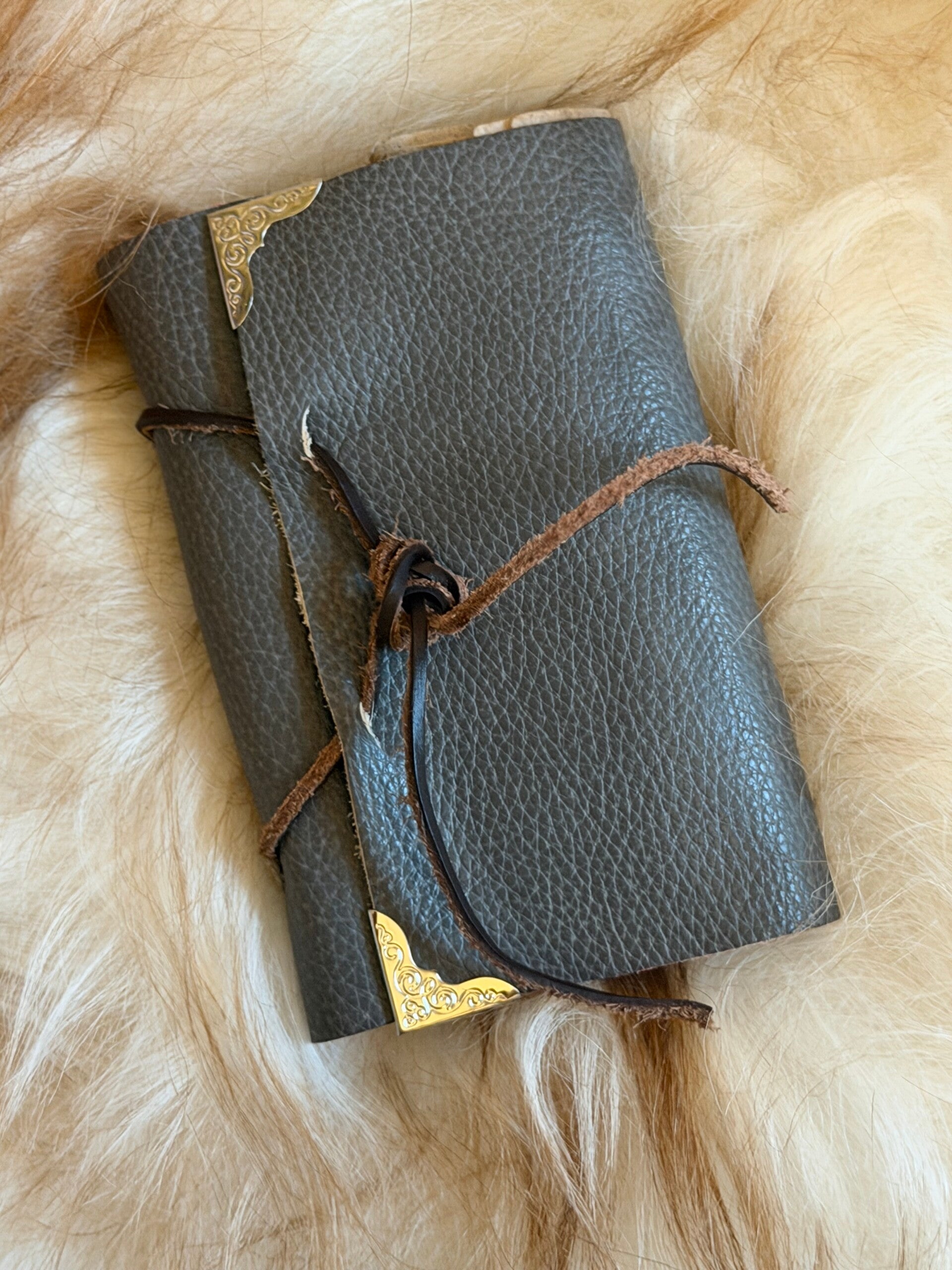 Handmade rundleren schrijf/schetsboekje en vetersluiting met geborduurde bloem op de flap en een binnenwereld van moerbeipapier